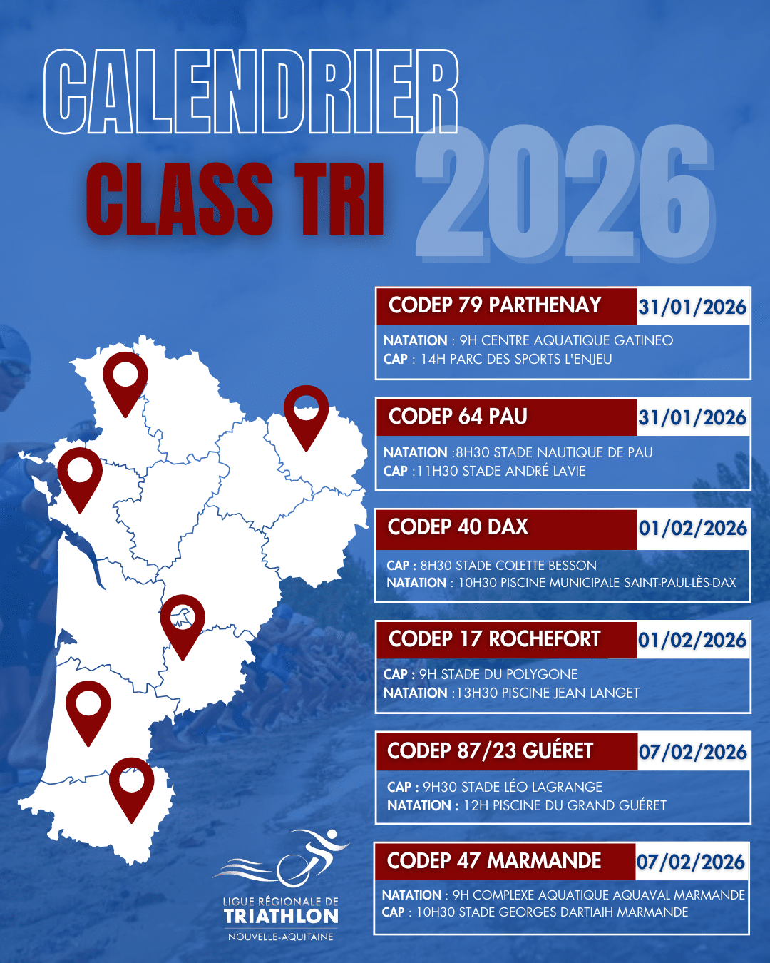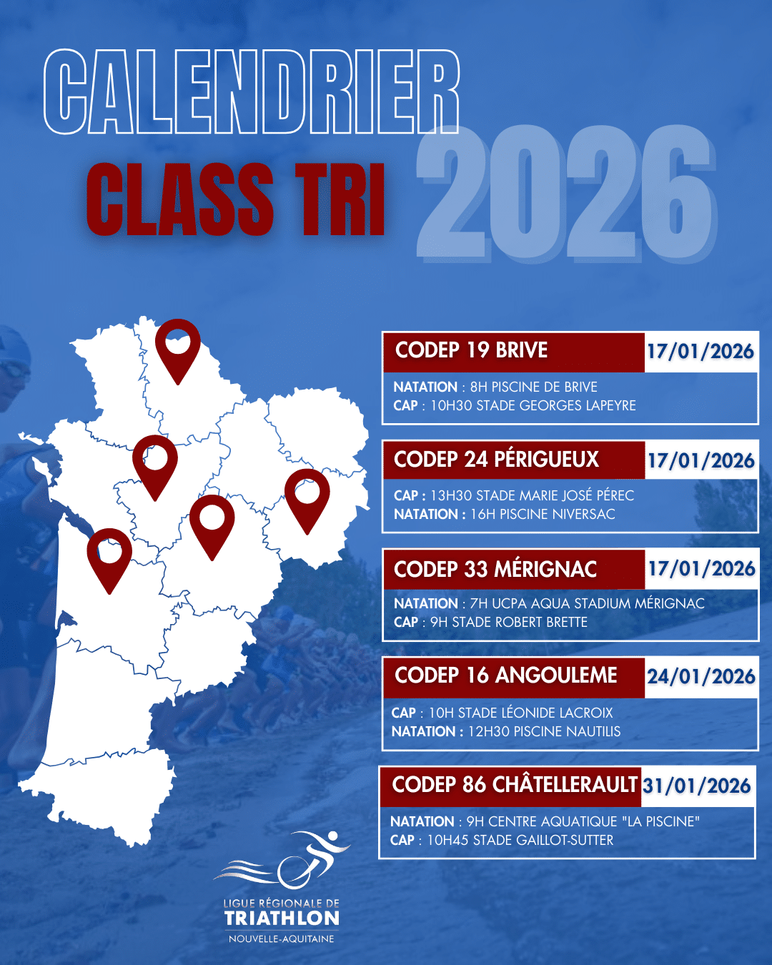 Les résultats du Class Triathlon 2026 serviront à déterminer le placement sur la ligne de départ du Sélectif Aquathlon 2026, qui se déroulera à Brive-la-Gaillarde (19) le 27 juin 2026.